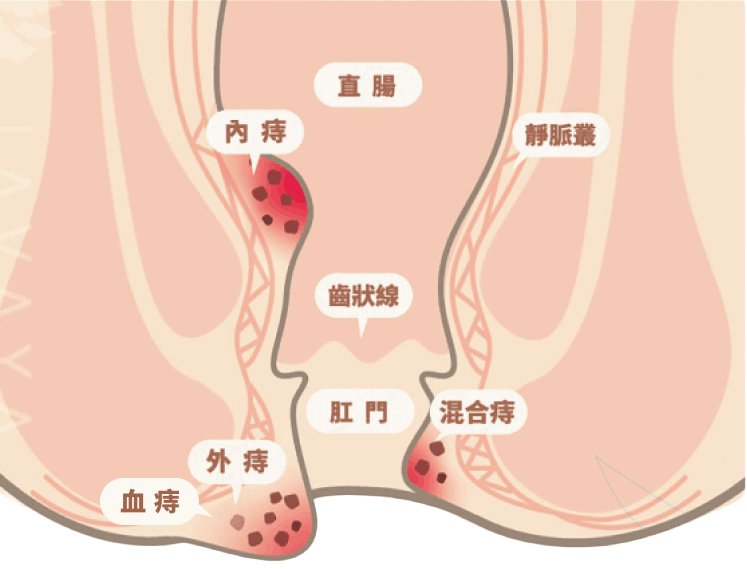 • 症狀:痔瘡永久性脫出,用手也無法推回,常伴隨血栓與劇烈疼痛。